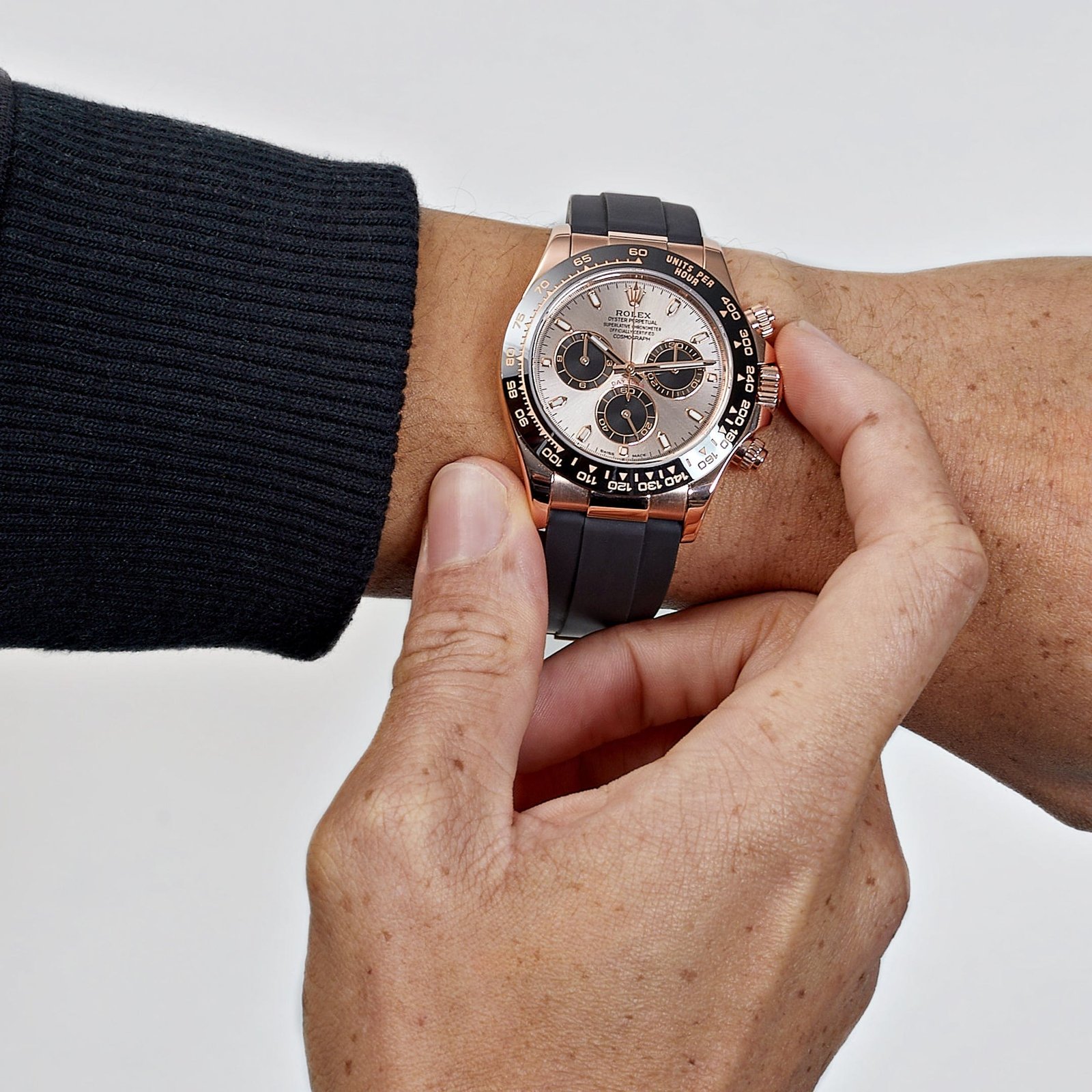 This 2025 Watch Daytona 116515LN?is designed in a 40mm 18k rose gold case. a ceramic bezel featuring?a Tachymetric scale. and a shimmering?sundust dial with black sub-dials.?The hour markers?and hands work with?Chromalight?display to provide optimal legibility. It is housed on a black rubber strap with a folding clasp. This 2025 Watch is the pinnacle between form. function. and fashion.?