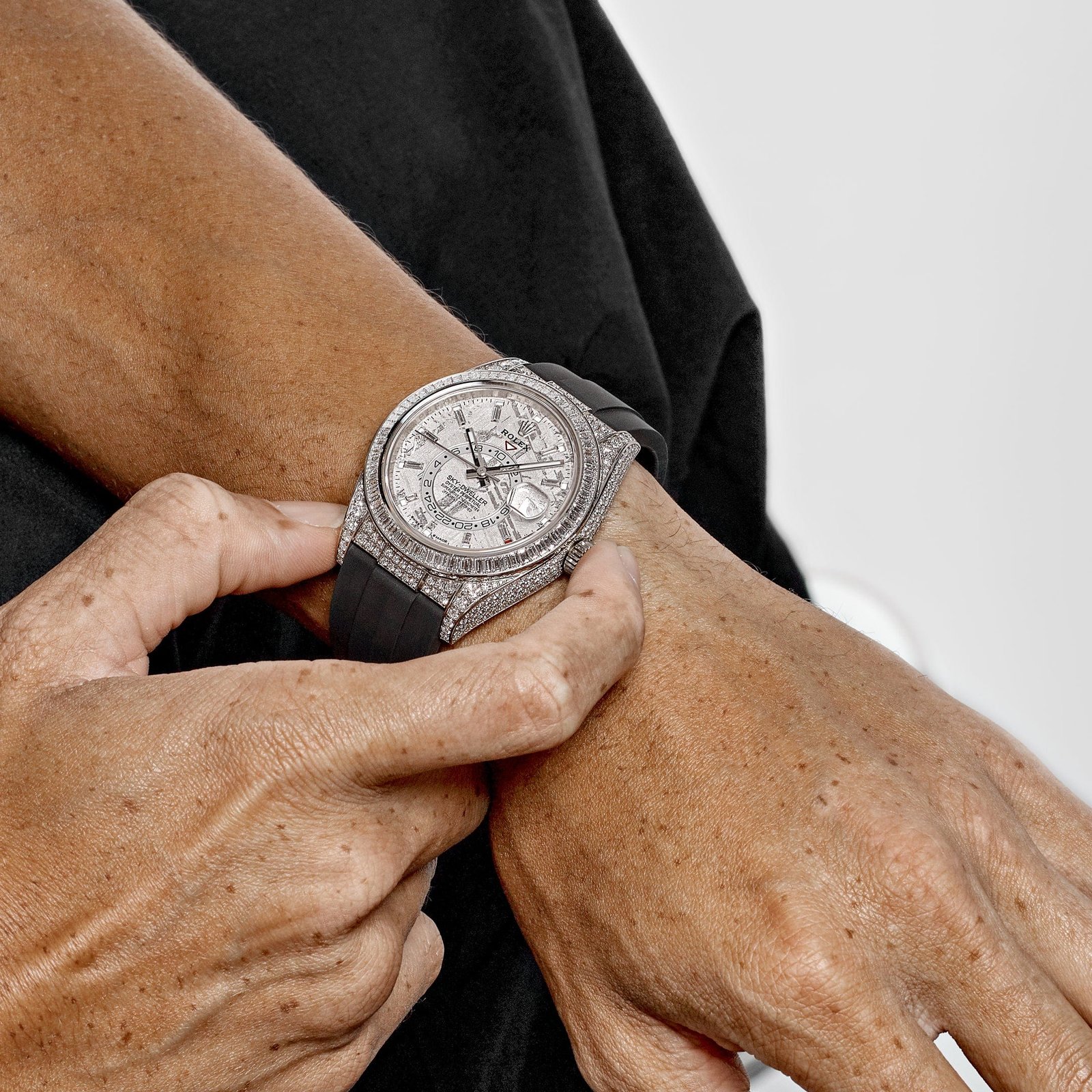 This?2025 Watch Sky-Dweller 336259TBR is a designed in a 42mm white gold case covered in a stunning factory pav??| diamond set. A meteorite dial features index hour markers. a date window at the 3 o’clock. an annual calendar. and GMT timekeeping functionality. Styled on a rubber bracelet for an extra bit of comfort. this incredible timepiece is the perfect companion for the exuberant traveling 2025 Watch enthusiast.?