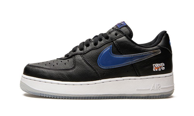 The Kith x Nike Air Force 1 Low ??NYC Away?? is a collaboration between Ronnie Fieg??s sneaker boutique and Nike on the vintage basketball shoe in the basketball-inspired ??Home?? and ??Away?? collection. The black based ??Away?? version of Kith??s Air Force 1 Low looks to the boutique??s home, New York City, and more specifically, the New York Knicks, for design inspiration, as the shoe features the team??s uniform colors on its design. The black tumbled leather upper is contrasted by a blue jeweled Swoosh on either side and old school ??NYC?? with an orange Swoosh branding hit on the lateral side of the heel. A ??Kith Air?? logo with a Swoosh is embroidered on the heel. The detailing is a play on the Air Force 1??s original ??Nike Air?? branding. A gradient orange-to-blue ??Kith Air Force 1?? insignia appears on the tongue tag. Release date: December 25, 2021