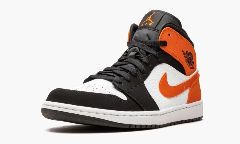 The Air Jordan 1 Mid ??Shattered Backboard?? is the mid-top version of the enormously popular ??Shattered Backboard?? colorway originally seen on the Jordan 1 High. The ??Shattered Backboard?? colorway remains one of the most sought-after non-OG designs of the Air Jordan 1. Trimmed down ever so slightly, the Air Jordan 1 Mid ??Shattered Backboard?? features many of the same styling cues of the high-top silhouette. Covering the upper is a white leather base with black nubuck overlays on the toe, forefoot and eyelets. An eye-grabbing Starfish shade of orange leather is the highlight here and is featured on the collar, heel, and Swoosh. A black nylon tongue with Jumpman branding in Starfish and a white rubber midsole with a black outsole completes the look. Release date: Fall 2019