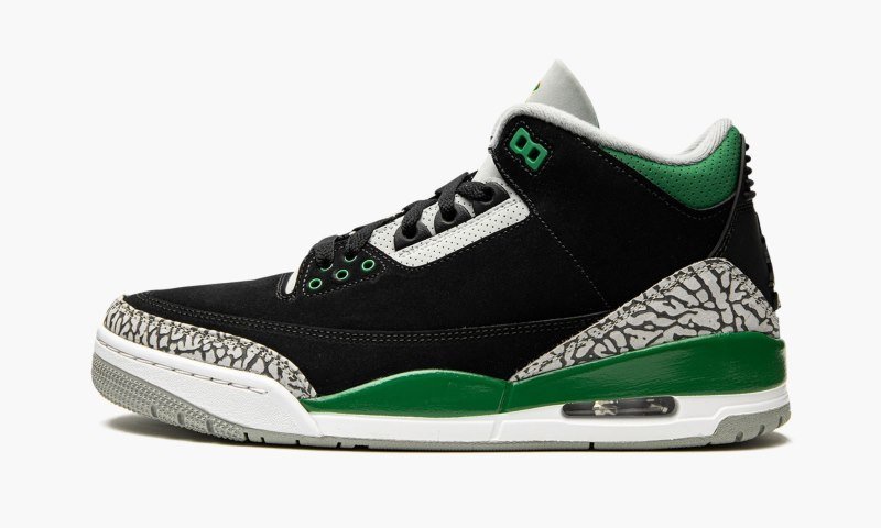 The Air Jordan 3 ??Pine Green?? is a Fall 2021 release of Michael Jordan??s third signature shoe in a colorway that mimics the look of an Oregon Ducks Player Exclusive model. In no way affiliated with the Nike sponsored university, the ??Pine Green?? is nonetheless a worthy tribute to the many classic Oregon Duck Player Exclusive colorways as the shoe is arranged in the same black, grey, and green color block of several hard-to-come-by Oregon PEs. The upper features a black tumbled leather construction with grey elephant print on the toe and heel. Pine Green accenting comes into play on the painted mudguard on the sides and on the dotted leather collar, top eyelets, and Jumpman on the grey leather tongue. A white Jumpman with an ??Air?? logo is found on the heel. Consistent with the original look of the Air Jordan 3, a small visible Air bubble appears in the heel of the white midsole. Release date: October 30, 2021