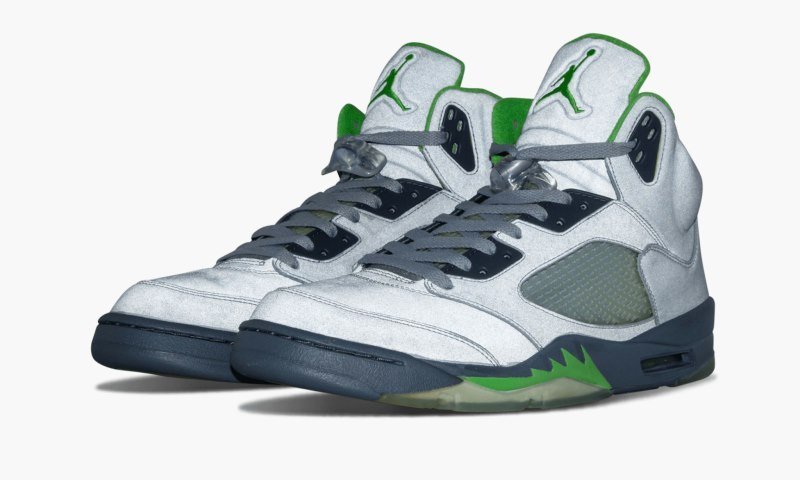 This unique colorway of the Air Jordan 5 from 2006 features a reflective silver upper accented with ??Green Bean?? throughout.