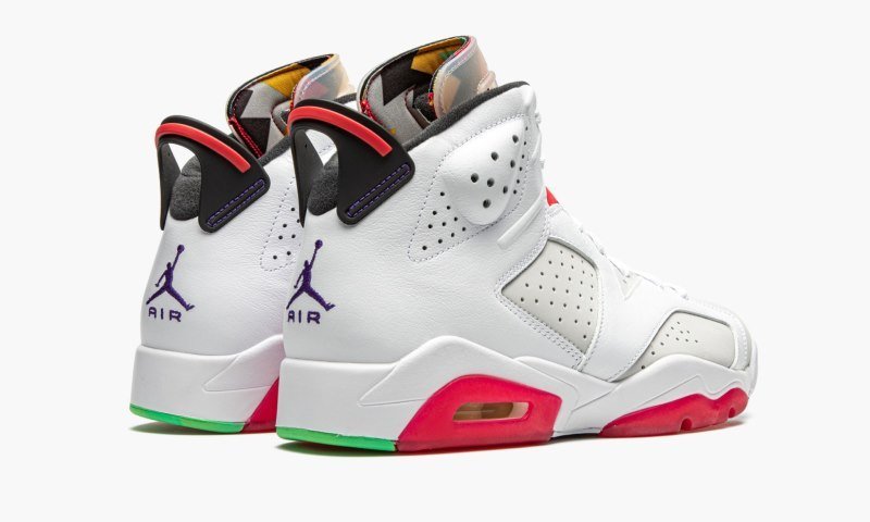 The Air Jordan 6 ??Hare?? is a Spring 2020 release that features overtures to another classic Jordan shoe: the original Air Jordan 7 ??Hare.?? Famously appearing on the feet of Bugs Bunny during the early ??90s television commercials with Michael Jordan, the ??Hare?? Jordan theme returns with a modern twist as Jordan Brand honors the legacy of ??The GOAT??s?? sneaker collection. White leather overlays contrast the light grey perforated synthetic nubuck base that appears on the mid-panel and toe. A red neoprene lace cover with a black Jumpman logo sits just below the clear rubber tongue that reveals the multicolor geometric pattern found on the Jordan 7’s tongue underneath. An orange and green lace lock that resembles a carrot adds the final special touch for the upper, while red translucent rubber highlights the sole. Release date: Spring 2020.