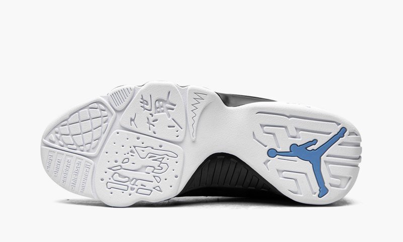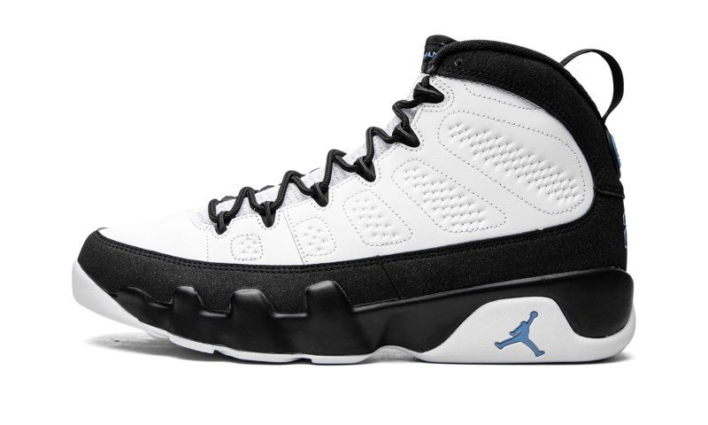The Air Jordan 9 ??University Blue?? is a clean look for Michael Jordan??s ninth signature shoe that draws comparisons to the original ??UNC?? or ??Powder Blue?? colorway from 1994. Collectors may recall ??His Airness?? suiting up in his old UNC Tarheels team uniform while wearing the OG ??Powder Blue?? Jordan 9 for Nike advertisements during his brief hiatus from the NBA in the mid ??90s, and the ??University Blue?? design pays homage to the ??UNC?? theme with subtle accents. The upper features a white leather construction with a ??diamond?? motif appearing along the medial and lateral sides of the shoe. A speckled black synthetic nubuck mudguard above the black painted midsole breaks up the look. Elsewhere, black rubber eyelets and rope laces contrast the white mesh tongue. Branding appears on the form of University Blue ??23?? embroidery on the heel and ??Air Jordan?? on the tongue. Additional ??UNC?? inspired accenting can be found on the mini Jumpman emblem on the sole and on the ??globe?? insignia on the heel. A black nylon pull tab on the heel and inner bootie lining complete the look of the Jordan 9 ??University Blue.?? Release date: December 5, 2020.