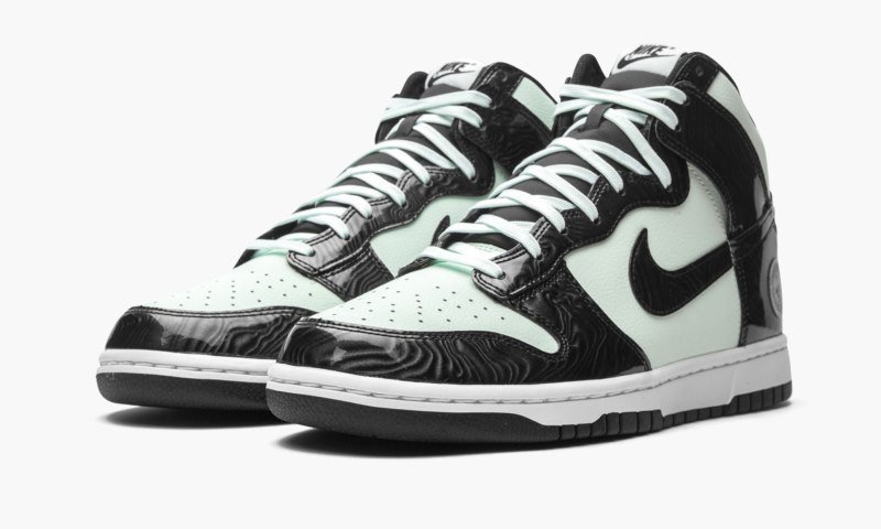 The Nike Dunk High SE ??All-Star 2021?? is a limited edition colorway that was released in celebration of the 2021 NBA All-Star Game. Joining an Air Jordan 1 Mid of the same nickname in honoring the NBA??s mid-season classic, the ??All-Star 2021?? Dunk High is dressed in an appealing upscale design. It begins with the glossy, wavy-textured detailing found on the glossy black panels and Swoosh layered over the upper??s minty green leather base. On the heel, a small NBA All-Star insignia is done up the same refreshing shade of green. The added circular patch actually references Indiana, which is where the 2021 NBA All-Star Game was scheduled to be held before the COVID pandemic altered the NBA’s plans. The laces and tongue??s branding tag also feature the Barely Green hue. A white midsole and black outsole complete the look. Release date: March 9, 2021.