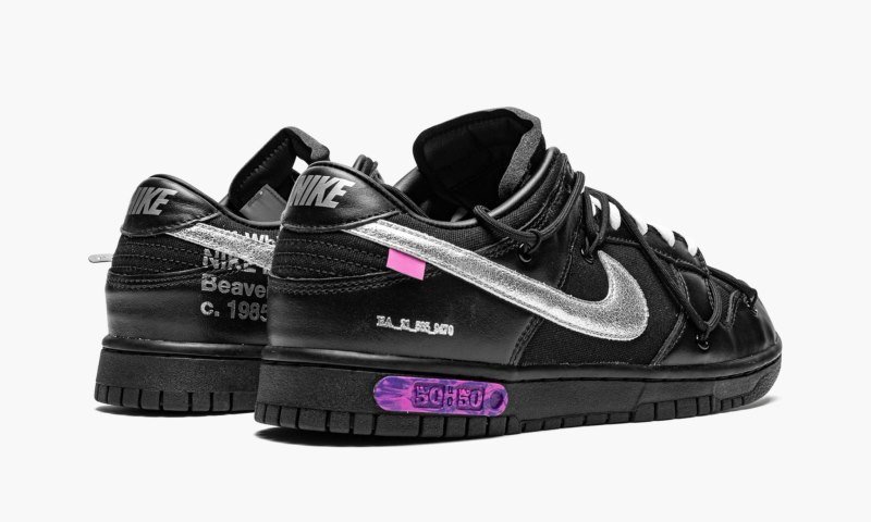 The Off-White x Nike Dunk Low ??Lot 50?? is one of multiple colorways of Virgil Abloh and Nike??s impressive Dunk collaboration from 2021. The follow-up to Abloh and Nike??s ??The 10?? collection from 2017, one of the greatest sneaker collaborations ever, the duo??s ??Lot 50?? campaign finds 50 different arrangements of the vintage basketball shoe, each with unique materials and embellishments. On ??Lot 50,?? the upper is constructed in a combination of black leather on the overlays and black canvas on the perforated toe and mid-panel. A Metallic Silver leather Swoosh appears on either side and silver ??Nike?? branding is found on the heel. Abloh adds a secondary lacing system to the upper in addition to the traditional lacing setup. The bungee cord-like look was first seen on Off-White??s debut Nike Dunk collaboration from 2019. Signature Off-White Helvetica text is printed on the medial side. Underfoot, a black midsole with a purple marbled ??Lot 50 of 50?? insert completes the look. Release date: August 2, 2021