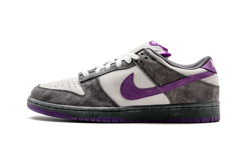 The Nike SB Dunk Low ??Purple Pigeon?? is a classic colorway of the low-top skate shoe that was released in 2006. Loosely inspired by the incredibly rare original ??Pigeon?? SB Dunk from 2005, the ??Purple Pigeon,?? designed by James Arizumi, mimics the white leather base and Light Graphite suede panel construction of the first ??Pigeon.?? More widely accessible at the time of its release, the ??Purple Pigeon?? also features a Violet synthetic nubuck Swoosh on either side and ??Nike?? embroidery on the heel. Additional purple accenting comes into play on the tongue tag with white ??Nike SB?? detailing. A puffy white mesh tongue and dark grey inner lining continue the model??s predominantly neutral design. Finishing touches include a grey rubber midsole and Violet outsole. Release date: November 2006.