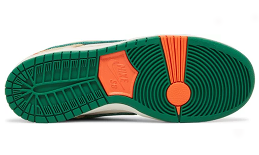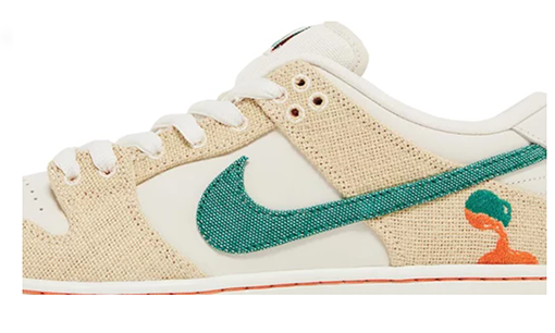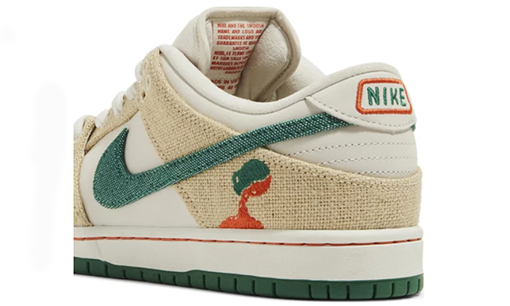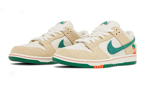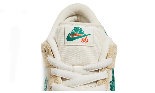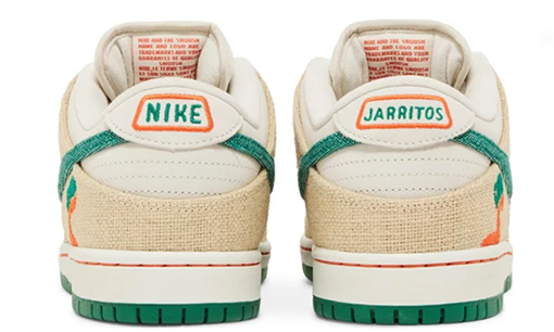 The Jarritos x Nike Dunk Low SB showcases a collaborative design inspired by the popular Mexican soda brand. The upper combines a white leather base with hemp canvas overlays and a green textile Swoosh. The Jarritos logo is embroidered in green and orange on the lateral heel, while dual branding embellishes the woven tongue tag. Mismatched heel tabs are emblazoned with ‘Nike’ and ‘Jarritos’ across the left and right shoe. Anchoring the sneaker is a durable rubber cupsole that pairs white sidewalls with a two-tone green and orange outsole.