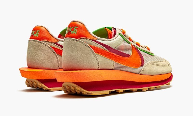 The Clot x Sacai x Nike LDWaffle ??Net Orange Blaze?? is a three-way collaboration between Edison Chen??s Clot streetwear brand, Chitose Abe??s high fashion line, and Nike on the hybrid shoe. A Fall 2021 release, the ??Net Orange Blaze?? marries Clot and Sacai for a take on the shoe that combines Nike??s LDV and Waffle Racer styles. The ??Net Orange Blaze?? colorway looks to Clot??s ??Kiss of Death?? Nike Air Max 1 for design inspiration, namely that shoe??s maroon, orange, and beige color scheme. The upper features a translucent base contrasted with beige suede overlays and layered Deep Red and Net Orange Blaze leather Swoosh logos. Two sets of beige and orange laces appear over the Deep Red and Net Orange Blaze nylon tongues. ??Nike Sportswear?? with an orange Swoosh appears on the green nylon tongue tag of the top layered tongue while Nike, Sacai, and Clot logos are found on the tongue tag of the underlaid tongue. Additional co-branding graces the heel. Underfoot, an orange elongated midsole with a gum outsole completes the look. Release date: September 14, 2021