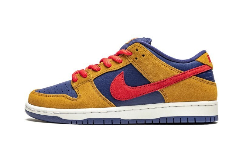 Blue/yellow/red suede/leather SB Dunk Low Pro sneakers from NIKE featuring signature Swoosh logo detail, embroidered logo to the rear, contrasting panel detail, round toe, perforated detailing, front lace-up fastening, logo patch at the tongue, branded insole and rubber sole. These styles are supplied by a premium sneaker marketplace. Stocking only the most sought-after footwear, they source and curate some of the most hard to find sneakers from around the world..