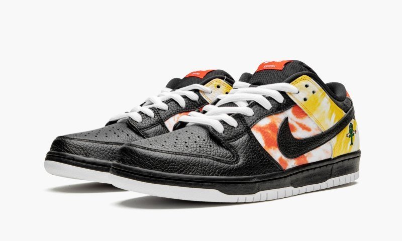 The Nike SB Dunk Low ??Rayguns – Black?? is a redesigned colorway that brings back the classic SB Dunk that released back in 2005. The black “Rayguns” SB Dunk is part of a ??home/away?? pack released in December 2019 that reproduces the original black and white colorways, but with a tie-dye treatment across the upper. The 2019 pack is a tribute to the late Sandy Bodecker, the Nike executive responsible for the rise of Nike SB in the early 2000s. Bodecker often wore a tie-dye Rayguns hoodie, which is the inspiration for the bringback of the “Rayguns” Dunks in his honor. This colorway features a black premium leather base with orange and yellow tie-dye accents. A green embroidered Raygun character can be found on the lower portion of the upper near the midsole. The Nike SB Dunk Low ??Rayguns 2019 – Black?? was released on December 27, 2019.