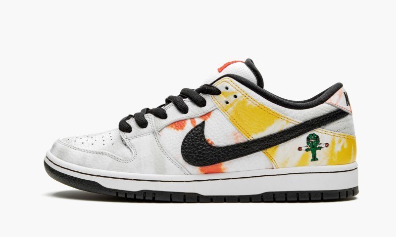 The Nike SB Dunk Low ??Rayguns – Home?? is a December 2019 release that brings back the classic mid-2000s SB Dunk design. This updated edition of the Rayguns theme features tie-dye graphics on the leather upper as an homage to the late Sandy Bodecker, the Nike executive responsible for the rise of Nike SB in the early 2000s. Bodecker often wore a tie-dye Rayguns hoodie, hence the remodeled tie-dye on the shoes. This white or ??away?? colorway of the 2019 ??Rayguns?? Dunk features a white leather base with a faint black tie-dye treatment and orange and white tie-dye accents. A solid black Swoosh and embroidered green Raygun character on the heel pulls together the look. The Nike SB Dunk Low ??Rayguns – Home?? was released on December 27, 2019.