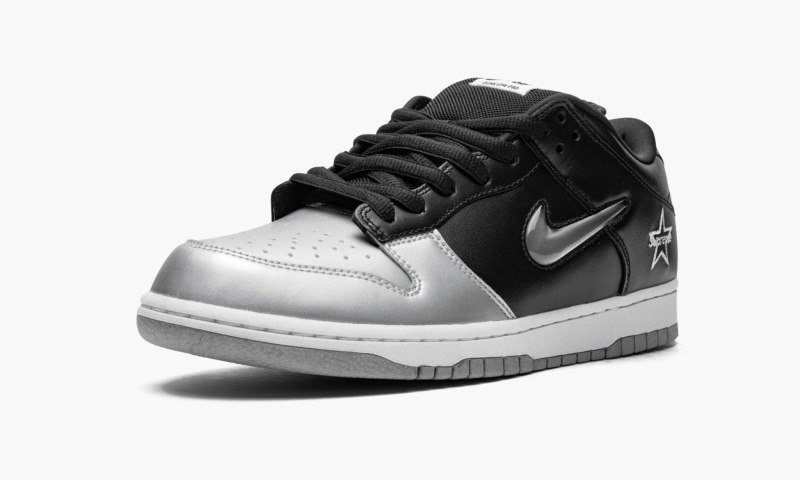The Supreme x Nike SB Dunk Low ??Jewel Swoosh Silver?? is one of three colorways released in the fall 2019 collaboration from Supreme and Nike SB. The theme of the collection takes cues from mid ??90s-era Nike Air Force 1 Mids that featured two-tone color blocks and jeweled metallic Swoosh detailing. Composing the upper of the SB Dunk Low is a black leather base with a metallic silver perforated toe. A silver jewel Swoosh appears on the mid-panel with a Supreme star logo embroidered on the heel. Nike branding hits are also included on the padded tongue tab and embroidered in silver on the heel. Wrapping up the design is a white midsole and silver outsole. The Supreme x Nike SB Dunk Low ??Jewel Swoosh?? in black and silver was released on September 5th, 2019.