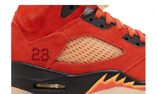 The Women’s Air Jordan 5 Retro ‘Dunk on Mars’ pays homage to Spike Lee’s alter ego, Mars Blackmon, whose planetary namesake is also known as the Red Planet. To that end, the heritage silhouette sports a scarlet suede upper, accented with translucent quarter-panel netting and contrasting black eyelets. Jumpman branding appears on the silver reflective tongue, while ‘23’ is embroidered on the lateral heel. The sneaker rides on an Air-assisted black polyurethane midsole with fiery shark-tooth detailing in orange and red. Underfoot, a yellow-tinged translucent rubber outsole features a herringbone tread for optimized grip.