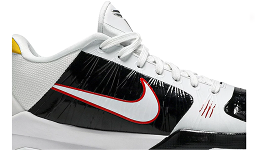 The Nike Zoom Kobe 5 Protro ‘Alternate Bruce Lee’ pays homage to the iconic martial artist with a design that takes its cues from the 2010 colorway inspired by Lee’s jumpsuit from ‘Enter the Dragon.’ The black and white color scheme adds yellow accents in a nod to the original, along with the distinctive red scratch marks on the lateral forefoot. While the original Zoom Kobe 5 featured Zoom Air cushioning in the forefoot and heel, this pair utilizes a large-volume Zoom Air unit only in the forefoot.